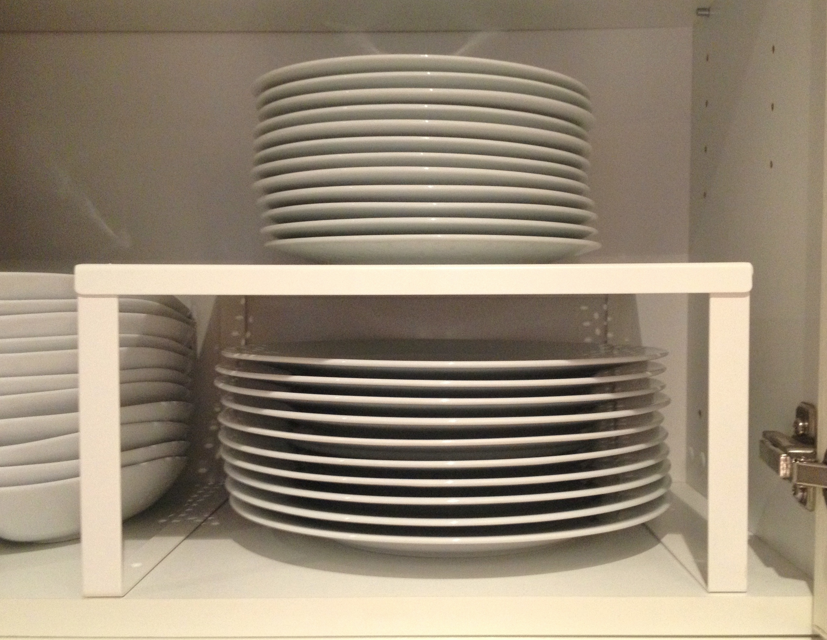 Stacking items like bowls and plates can save you a lot of space in the cupboards. I use IKEA Variera Shelf inserts. They are available in two sizes.