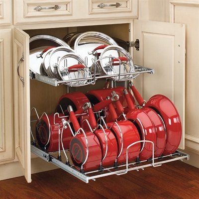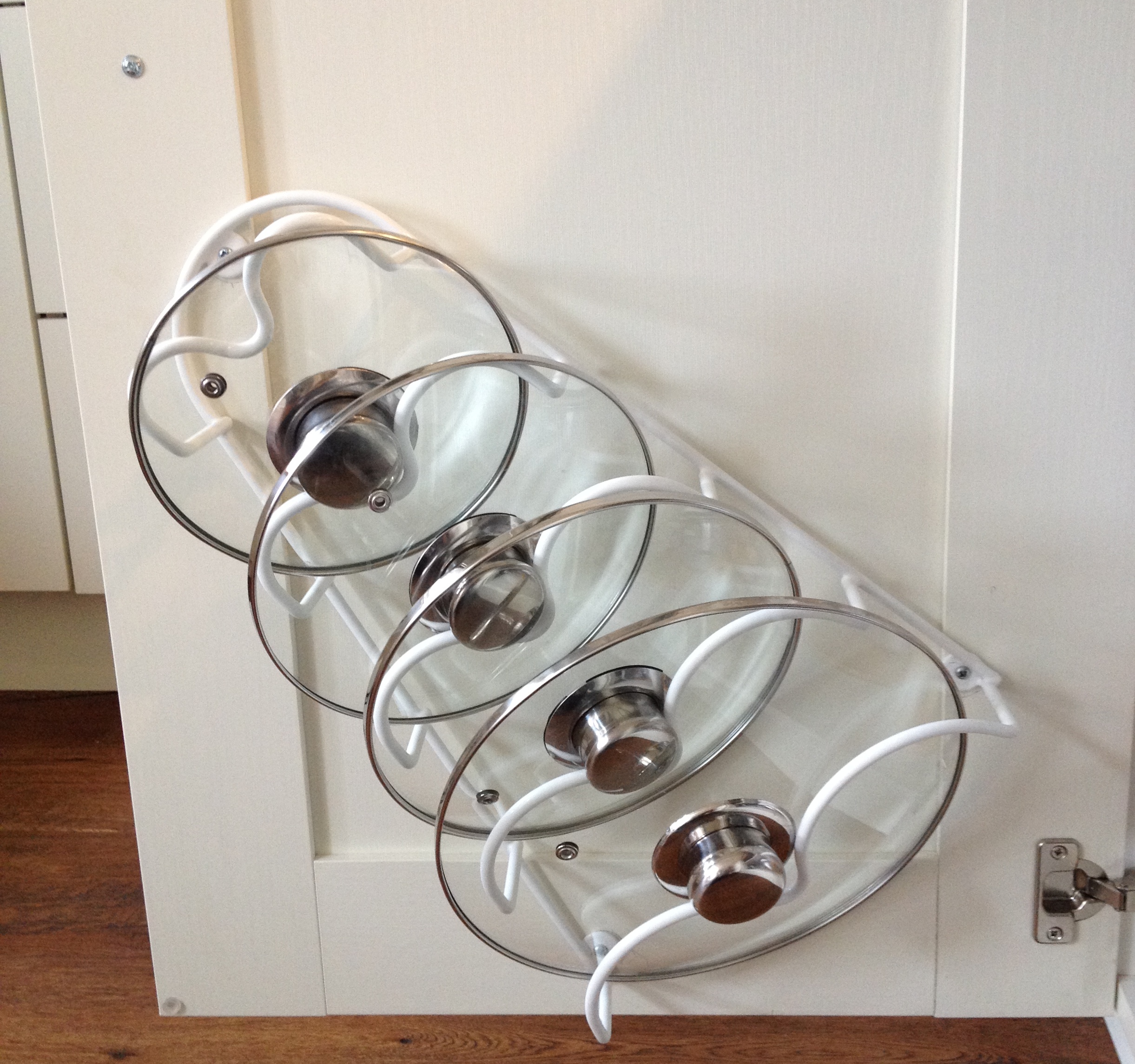 Use racks to organise your pot lids. These can be installed inside your cabinets or on the cabinet doors. These racks will save you tons of space so they are great investments. You can get them either on Amazon or eBay.