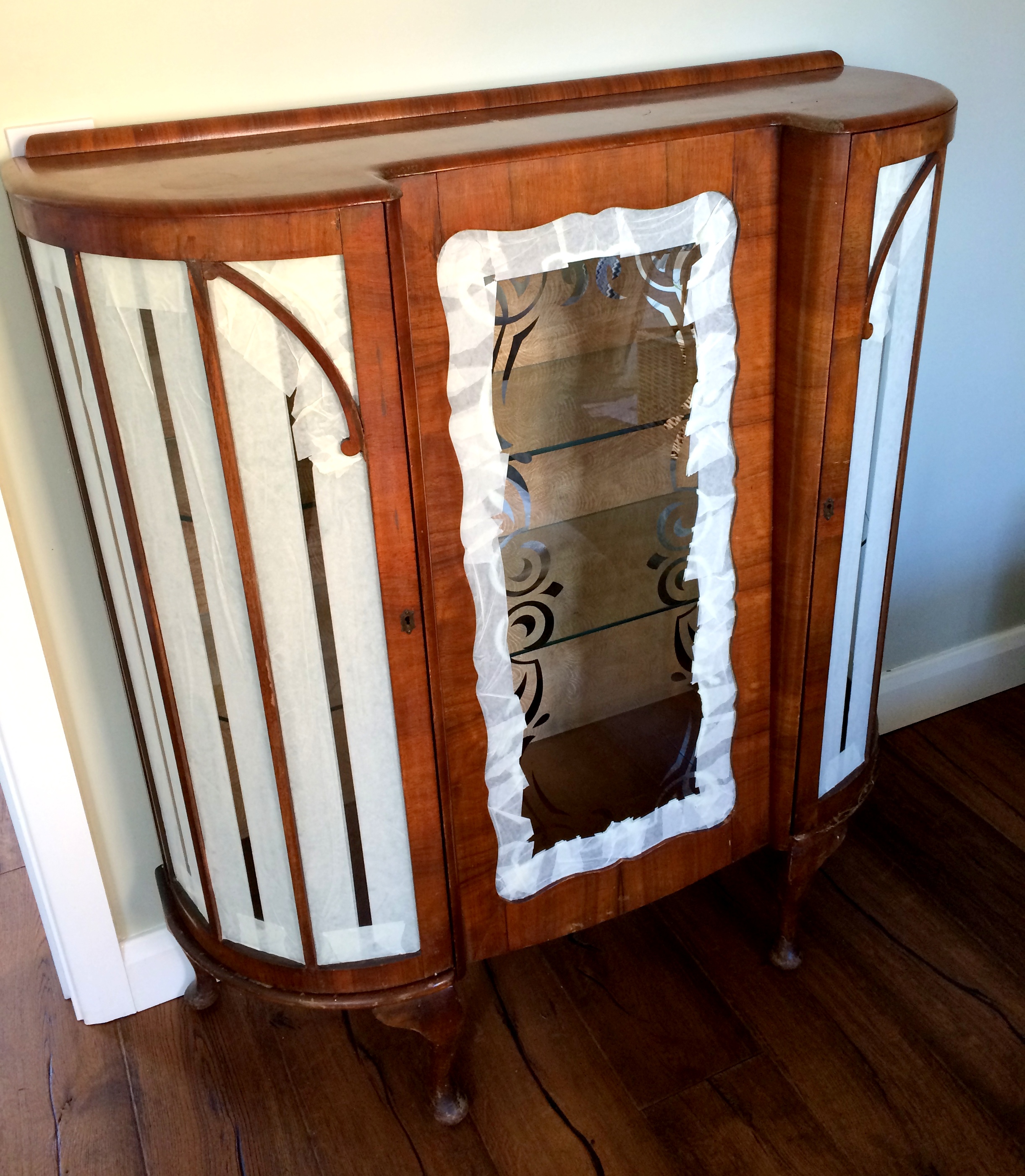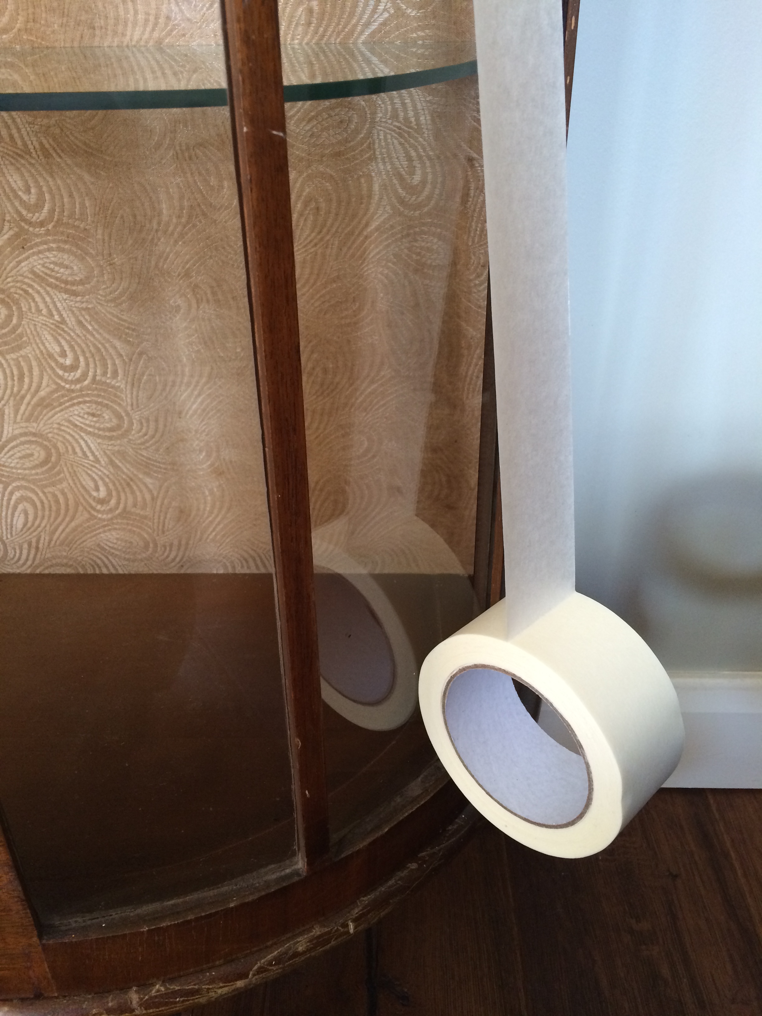 Make sure you have all the tools to do the work (check my list and pictures above) otherwise it will take you twice as long to finish the project. We started with removing the shelves and protecting the glass door and glass front from paint with a masking tape. I used my craft knife to cut the tape excess. We also removed the doors from the rest of the cabinet (it’s easier to sand and paint when you do this). We also removed the old piece of fabric from the back of the sideboard (it really stunk)!!