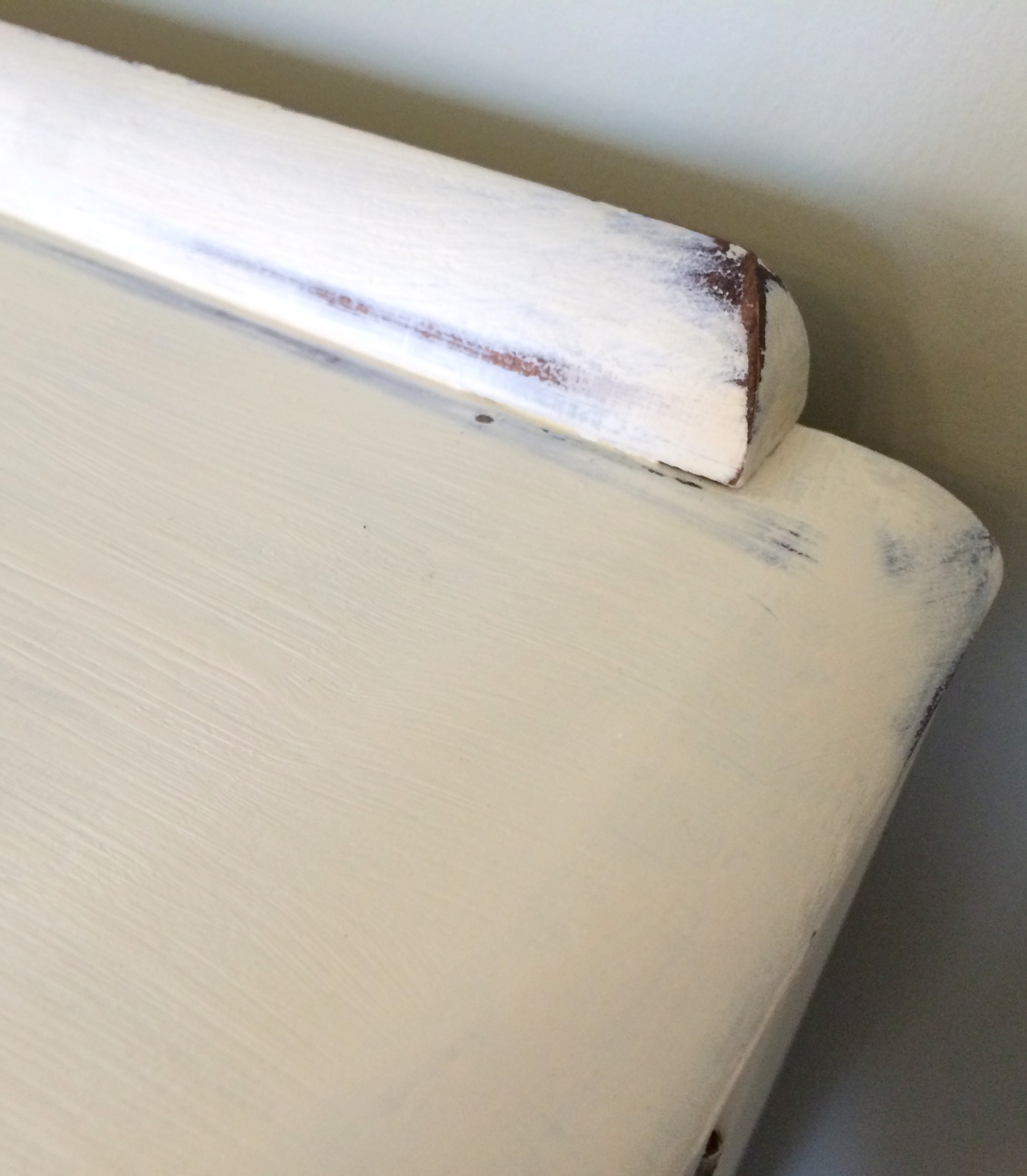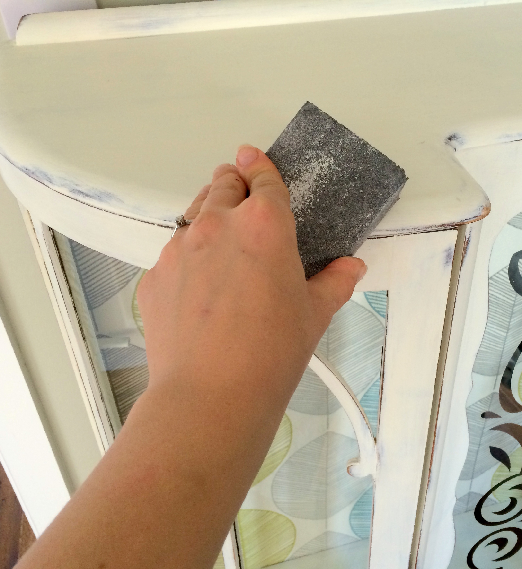 It’s entirely up to you how distressed you want your piece of furniture to be. There is no right or wrong way to do it; just grab a piece of sand paper or steel wool and go over the top and over the edges, don’t be afraid- get off that paint!! Think where the obvious signs of wear usually occur and sand the paint off from these spots. You can go as wild as you want at this stage of the makeover. We personally went for the ‘edges only distress’.