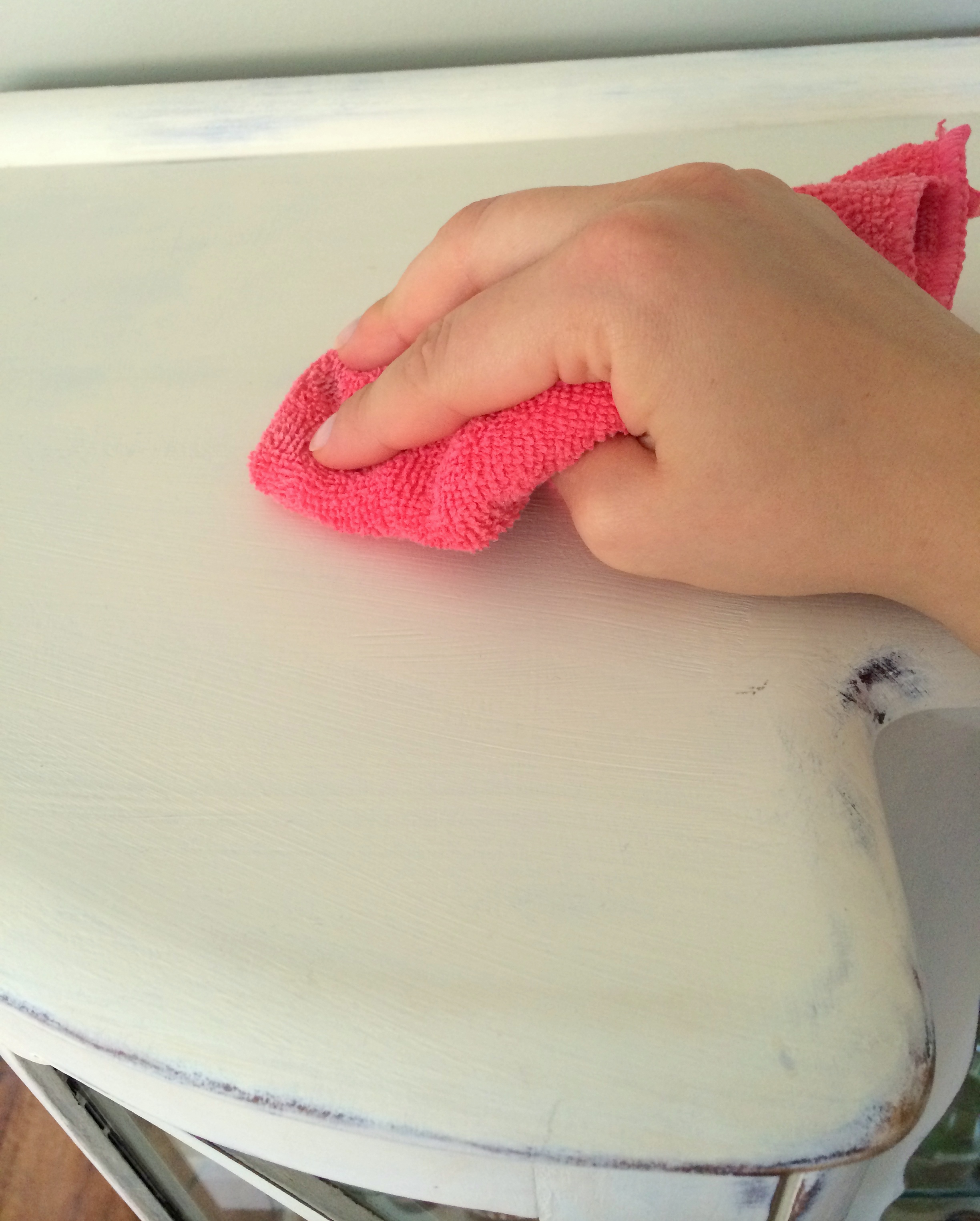 Unfortunately chalk paint requires sealing. I sealed it using clear beeswax form B&Q. Wax is a cheap, effective and easy to use sealant. Using a clean cloth apply a generous layer of wax over your piece, leave it to dry for an hour and then buff it up.  Yes, waxing is time consuming, but well worth the elbow grease because the results are simply stunning. Remember that chalk paint will always go slightly darker after waxing- its good to remember it at the beginning of your project when it comes to selecting paint colours.